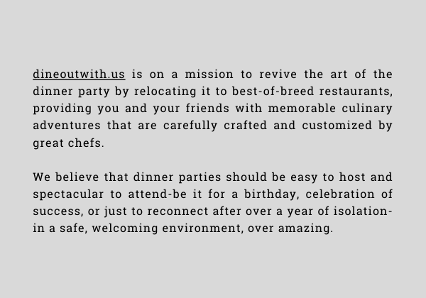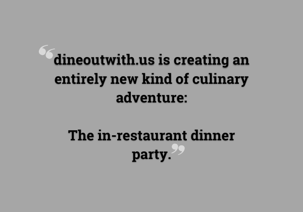 The dineoutwith.us experience starts when you select a restaurant, date and time, and a customized menu priced on a per-person basis. You then create a guest list of friends, family, or colleagues, and our powerful, easy-to-use platform takes over from there, managing the entire booking process and keeping you updated as people RSVP. We also collect dietary preferences and food allergies from each guest, and collect all payment in advance––no check splitting!